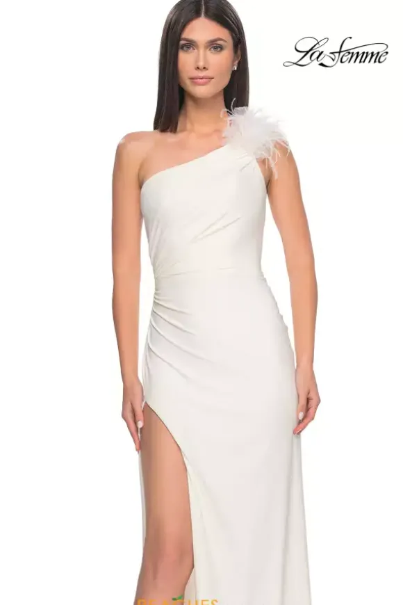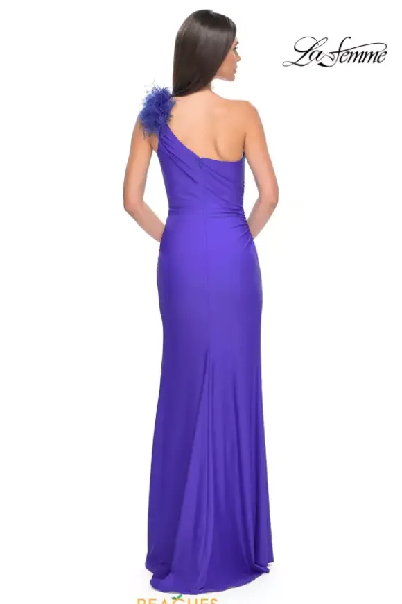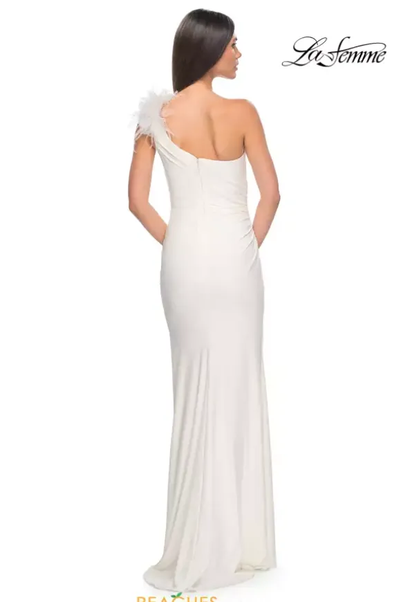 Less is more with this sleek and sexy La Femme prom dress 32076. This fitted jersey dress is perfect for hugging your curves and features ruching along the seams of the thigh high slit. The asymmetrical single shoulder neckline features a unique feathered embellishment that gives this dress an elegant finish.