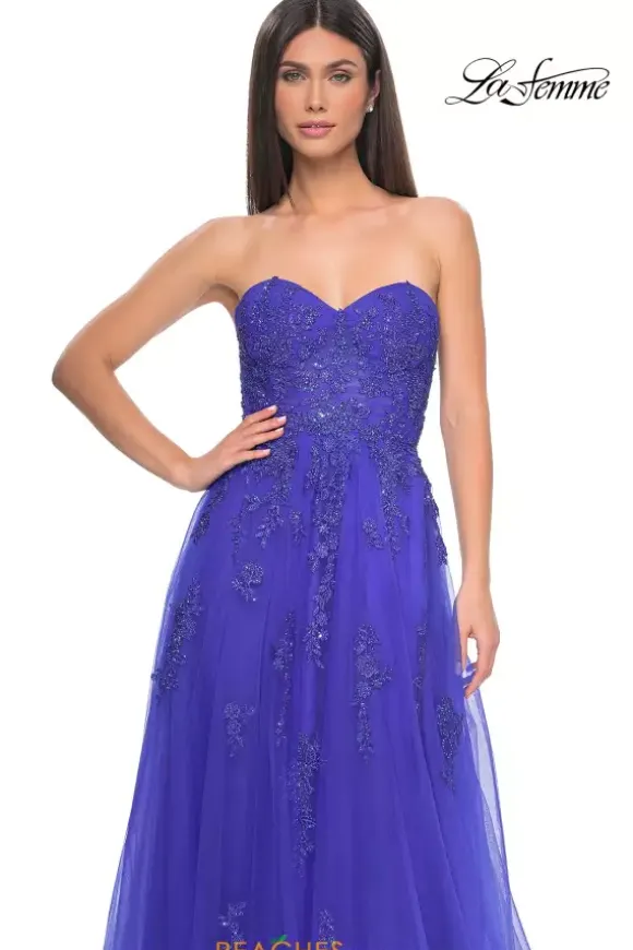 Available in the trendiest colors, A-line prom dress 32084 designed by La Femme is the perfect pick for your special event. This corset A-line dress features a strapless sweetheart neckline along with an adjustable lace up closure while the flowy skirt reveals a hidden thigh high slit and horsehair hem. Beaded lace details are featured throughout the entire dress for a stunning sparkle.