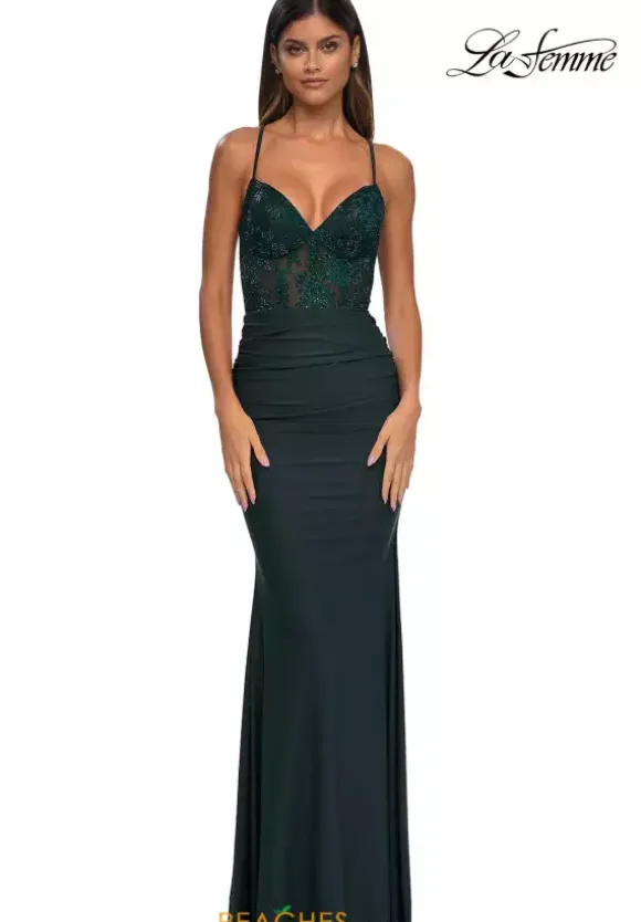 Experience an enchanting night in this precious long fitted dress by La Femme, style 32217. Showcasing a beaded and lace V neckline and sheer corset with an absolute must have corset lace up. The jersey material skirt hugs your body beautifully and flows down into a gorgeous long train. You will for sure going to have all eyes on you.