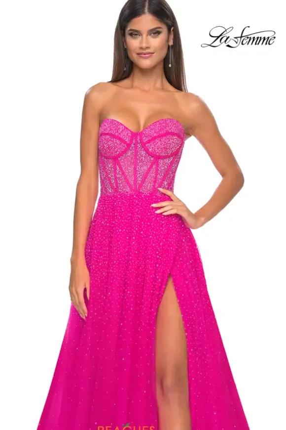 Everyone will stop and stare when you choose La Femme long dress 32278 for prom night. This stunning gown showcases a captivating sweetheart, strapless neckline paired with a dazzling beaded corset bodice. Dazzling beads cascade from the fitted waist to the tulle skirt featuring a high slit , this style will have you picture ready from every angle.