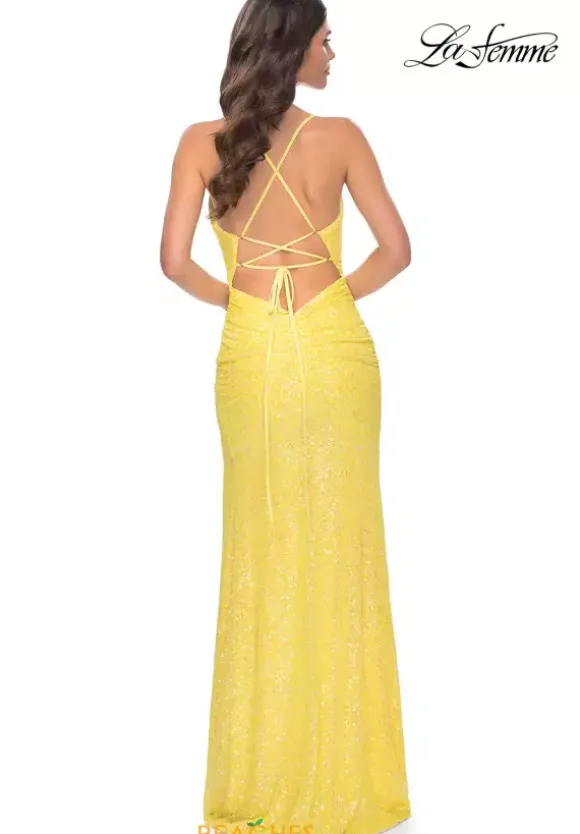 Dazzle the crowd in this glistening fitted and long style dress by La Femme, style 32330. This dress comes in two fabulous colors including a perfect purple shade and a vibrant yellow. This dress also has a lovely sweetheart neckline and is made with glittering sequins that will have you looking like a complete star.