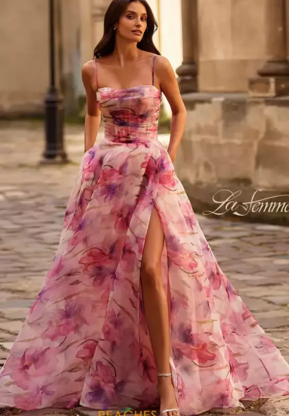 Fascinate the crowd when you enter the room wearing this absolutely gorgeous long A line dress by La Femme, style 32686. This dress is made in lovely floral organza that gives you that soft beautiful look. Featuring a scoop neckline with dainty straps and a lovely corset. The skirt and long train flows beautifully together while the slit allows striking poses.