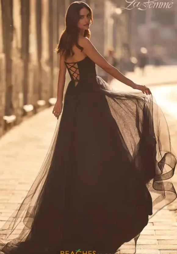 Exude elegance in this simple and timeless design by La Femme style number 32731. This classy gown features a classic strapless sweetheart neckline and a corset lace up bodice. The whimsical skirt is entirely made out of tulle allowing for that gorgeous flowing effect. The sexy thigh high slit and sweep train add the perfect final touch to this lovely dress.