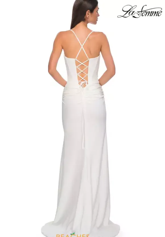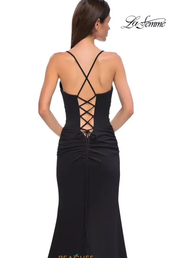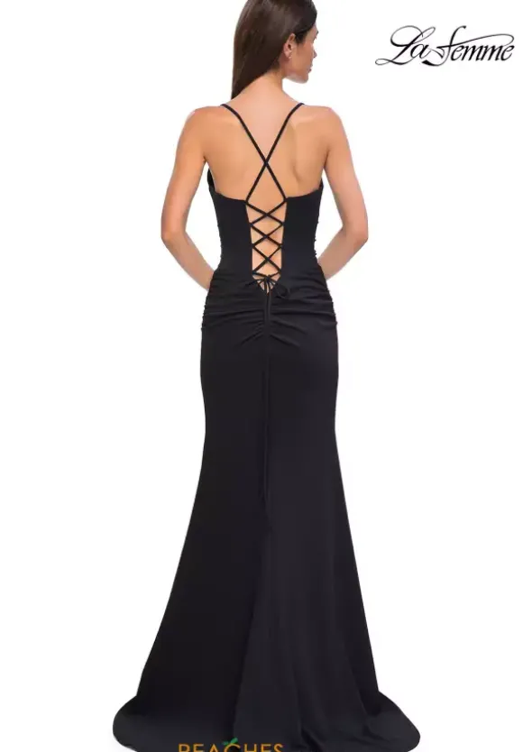 Show off your body when wearing this long a line dress by La Femme style, 32802. Showcasing a modern v- neckline thats embellished with glistening beadwork and delicate thin straps leading to an exquisite intersecting open corset lace up back that will hug your bodice phenomenally ending with a back zipper closure. Featuring a jersey bottom with ruching which will hug you nicely. To amp up the drama it has a classy high thigh slit and a lovely train.