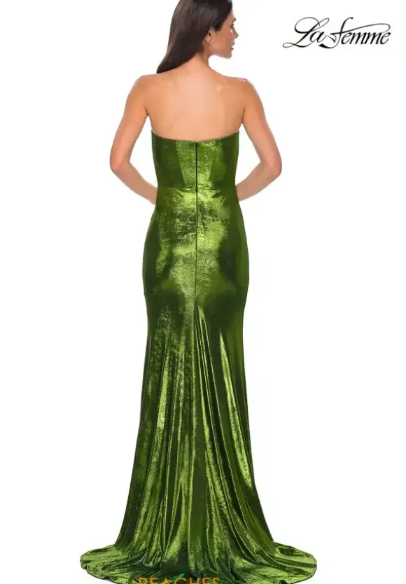 Become your own inner fashion icon when wearing this long fitted dress by the one and only La Femme, style 32828. Featuring a modest strapless sweetheart neckline leading to a back zipper closure. The silhouette of this ensemble will hug your bodice beautifully that will have all eyes on you. Showcasing a unique fitted shiny jersey lame bottom with a classy thigh high slit and a gorgeous train.