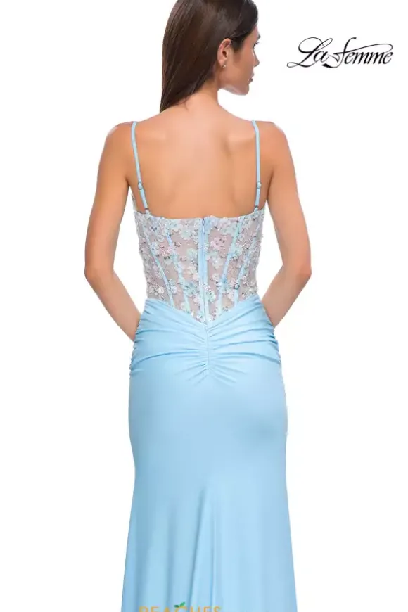 Embody a fairy tale princess when you decide to wear this beautiful dress by La Femme style 32957. This fitted silhouette features a deep v neckline with a mesh panel for modesty paired with adjustable straps and a back zipper. The floral sheer corset is the perfect amount of detail to match the the ruched skirt. The slit is paired amazingly with the sweep train.