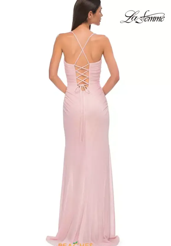 Amaze everyone when entering your next event with this jersey style dress made y La Femme, style, 32964. This fitted dress features a sweetheart neckline suspended by two dainty straps which cross over to reveal a corset lace up. The top is crossed over and pairs gracefully with a slit and a sweep train. This simplistic dress is perfect for almost any occasion.