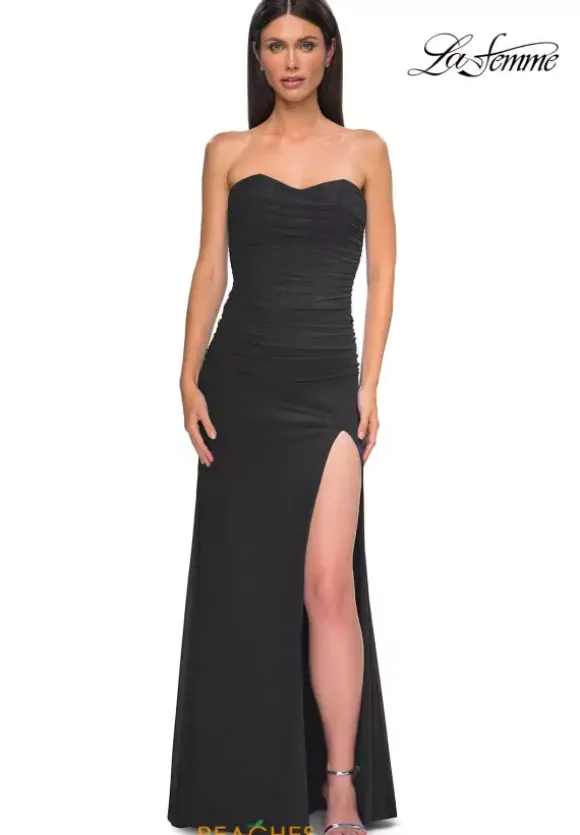 Have all attention on you when you wear this stunning stress by La Femme style 32990. This fitted silhouette features a strapless and sweetheart neckline supported with a corset lace up and a back zipper. The subtle lined corset is covered in sheer net material. The jersey material skirt reveals a thigh high slit and an amazing sweep train.