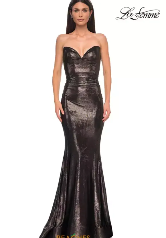 Be your own fashion icon when wearing this long fitted dress made by La Femme,style 32995. Showcasing a soft strapless V-neckline and a corset lace up back bodice. It is made out of lame material and ruching details that go along the bodice, side seams, and the back zipper. Complete this piece with a beautiful long train.