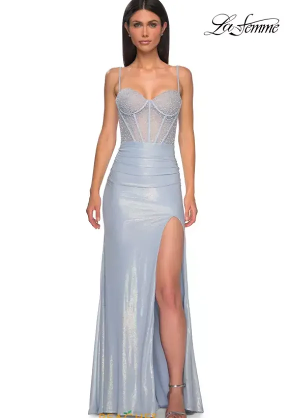 Have a major fashion moment in this dazzling long fitted dress by La Femme, style 33003. Featuring a glistening beaded bodice with a sweetheart neckline and sheer corset with exposed boning that adds to the beauty of this ensemble. This jersey skirts has a appealing slit and long eye catching train that completes the look.