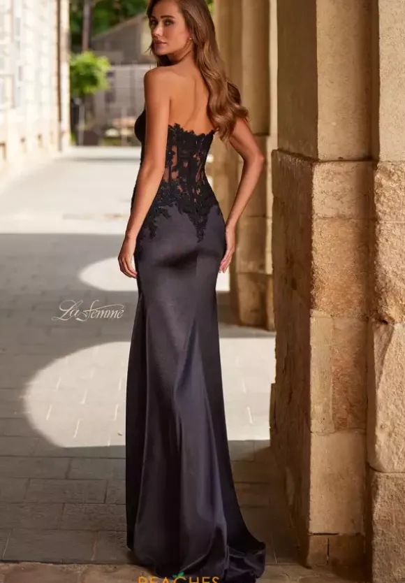 Sophisticated long style 33419 by La Femme will surely leave that everlasting impression. Featuring the illusion bodice delicately embellished with lace applique and complimented with sweetheart neckline. Showcasing fitted jersey skirt detailed with a thigh high slit and lovely flyaway train to follow you effortlessly.