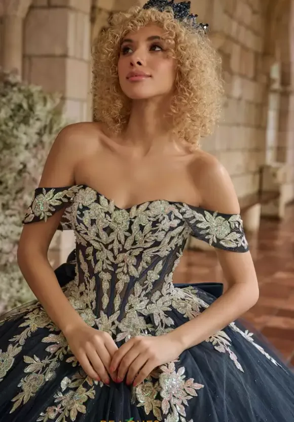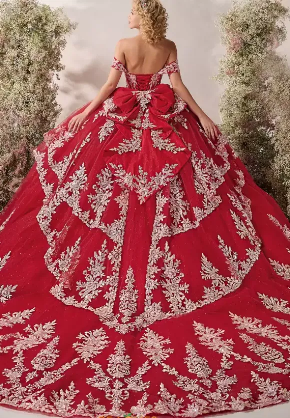 Twirl all night long in this phenomenal ball gown by LizLou, style 26126. This ensemble features a stunning corset and sweetheart neckline with the most beautiful off the shoulder cap sleeves. The glitter tulle skirt has a perfect bow and long train that is truly picture perfect. Fully adorned in applique and beadwork, you will for sure feel like a princess on your special day.