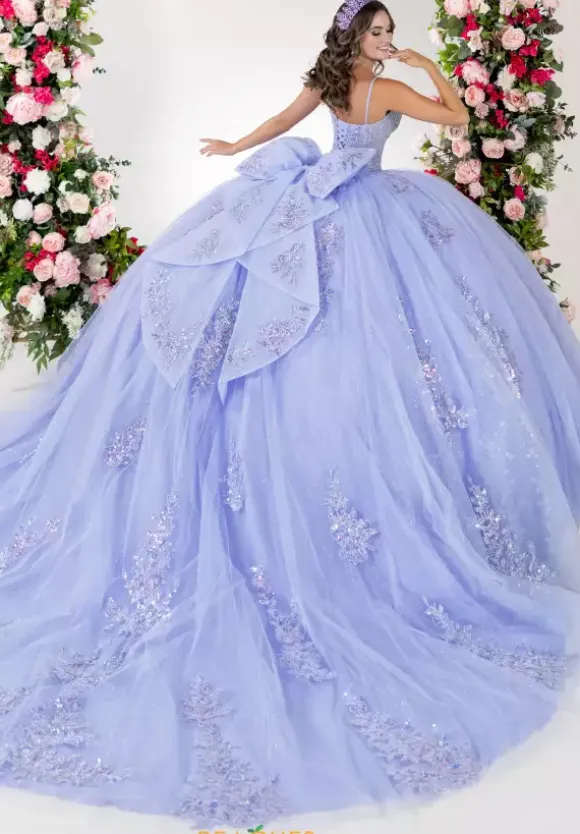 Choose to shine on your special day when you wear this traditional style LizLuo Quinceanera ball gown 26132. The fitted corset bodice includes the traditional corset lace up closure on the back while radiant hand beaded appliques deck out the front and skirt of the dress. An oversized bow embellishment is displayed on the back of the full glittering tulle skirt.