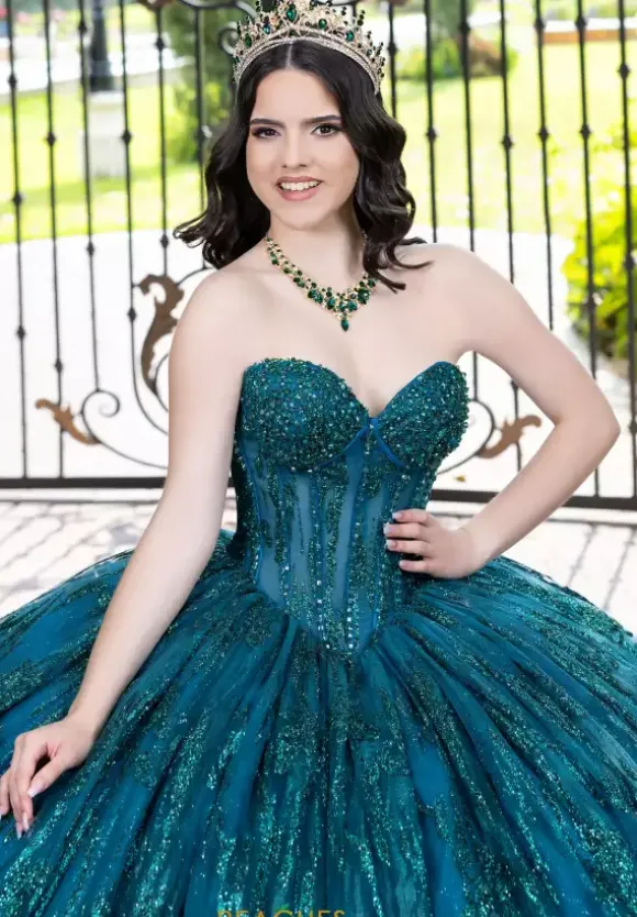 Leave an everlasting impression wearing the striking ball gown style 56528 by LizLuo Quinceanera. The strapless sweetheart neckline is detailed with glittered sequin all over the fitted illusion bodice and cascades down the entire full tulle skirt to the end of the beautiful fly away train to have you photo ready from all angles.