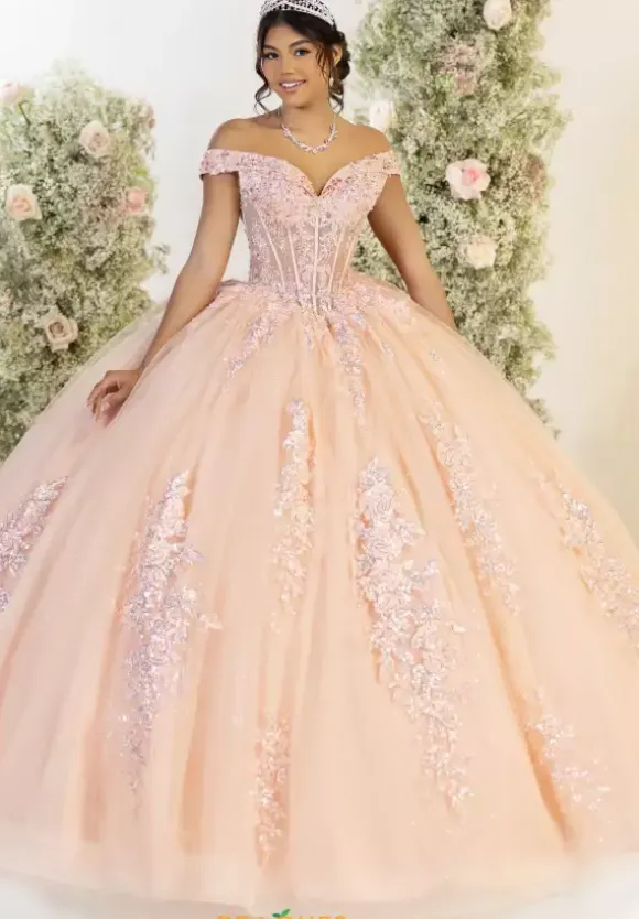 Reflect light from every angle in this vivacious LizLou Quinceanera ball gown style 56556. Every aspect of this traditional lace up ball gown is glistening. Ornate appliques, beads, and sequins shine radiantly on top of the glittering tulle skirt and sweep train featured on the bow embellished back.