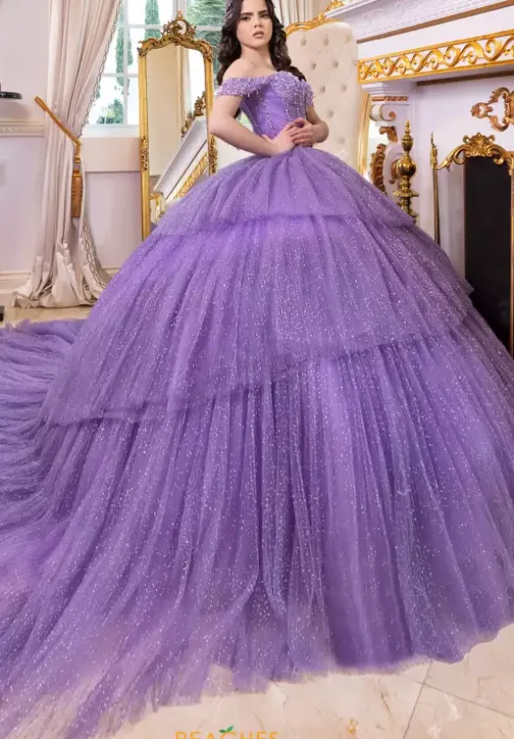 Sparkle bright all night long in this extravagant quinceanera dress by LizLuo, style 80018. Showcasing a sweetheart off the shoulder cap sleeve top. The bodice is adorned with fabulous glistening beadwork. The best part os this ensemble is the layered glitter tulle skirt. For the perfect final touch you have the long beautiful train.
