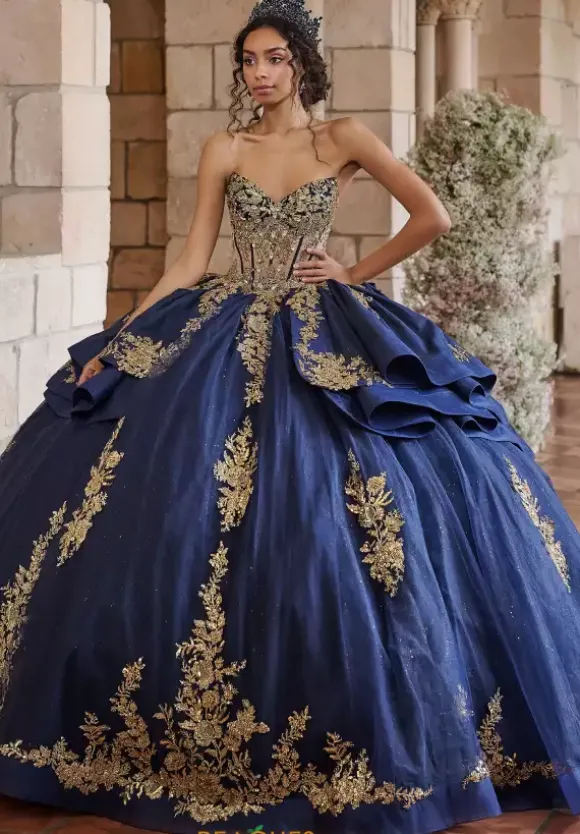 Be your own modern day fairy tale princess in this LizLuo Quinceanera ball gown style 80050. This glamorous dress showcases shimmer metallic gold appliques that adorn the sweetheart neckline bodice. Off the shoulder cap sleeves are detachable. The full glitter tulle skirt flows to the ground with the right amount of fullness.