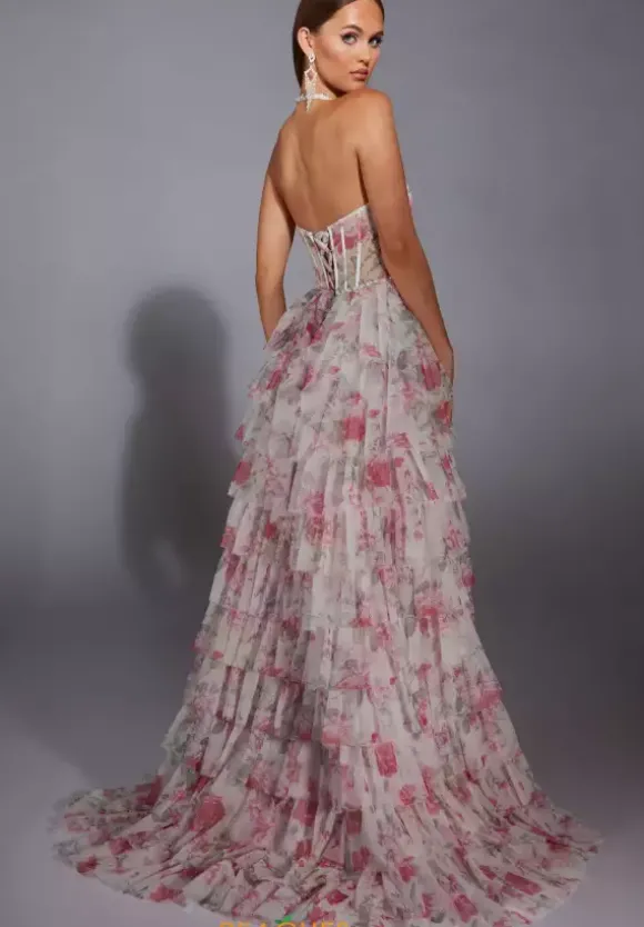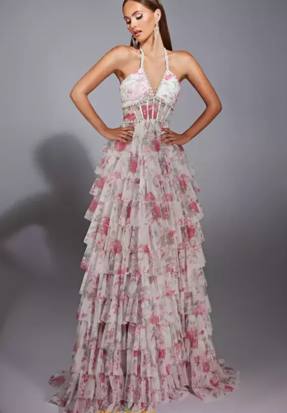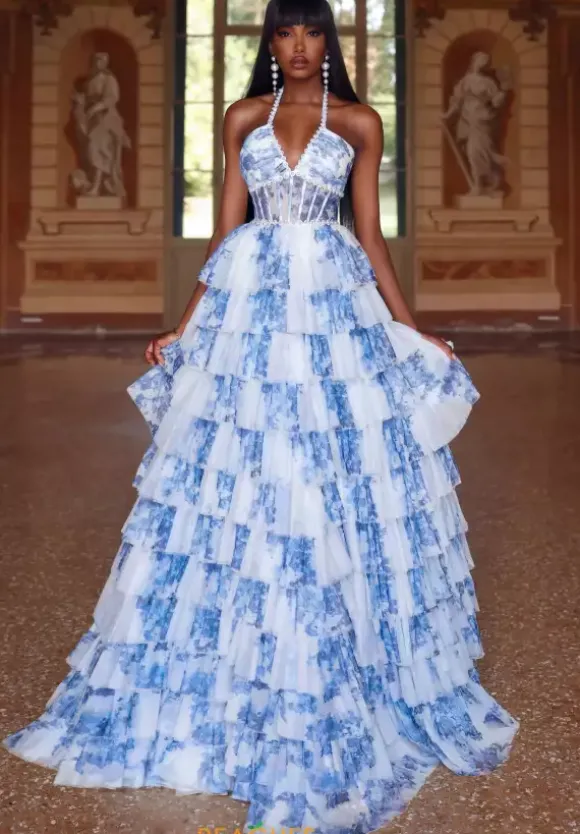 Feel like a modern day princess in this enchanting long dress by Alyce, style 61730. Showcasing an a-line silhouette with a halter v neckline, that has beaded straps. This number has a corset bodice, with a lace up back. The floral print detail along the layers on the skirt is the perfect final touch.