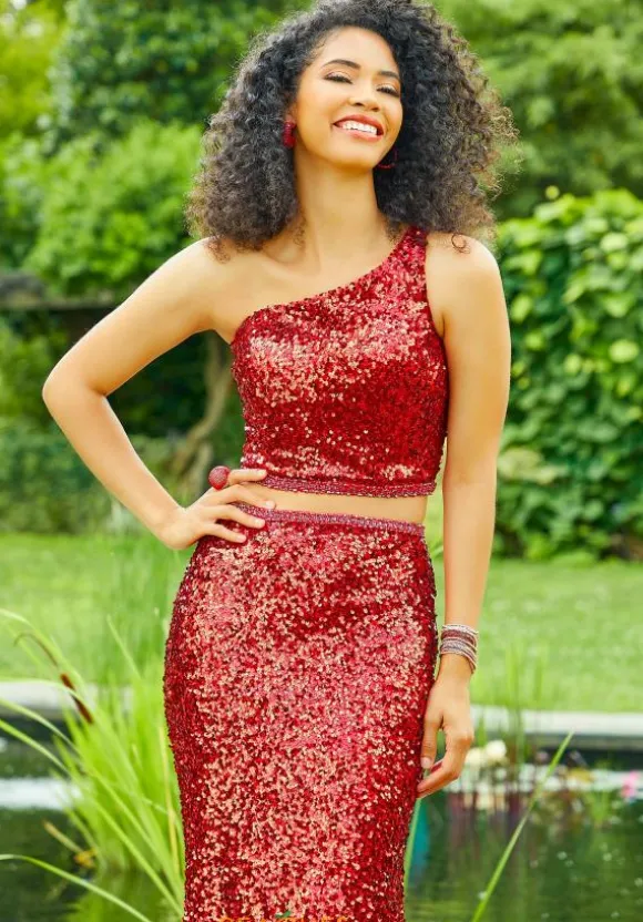 Show off your amazing fashion sense and wear this ravishing long dress 47023 by Morilee. This two piece style is completely embellished with shining sequins to ensure a sparkle from every angle. The crop top has an asymmetrical neckline and zipper back closure. Matching perfectly, the fitted skirt showcases a lovely sweep train.