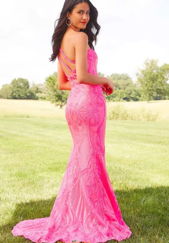 On trend long dress 47032 by Morilee is available in bold neon colors. This dazzling dress is adorned with elegant lace appliques that shine gorgeously from every angle. The asymmetrical neckline has a thick strap that wraps into a strappy open back. The slimming silhouette features a side front slit and sweep train.