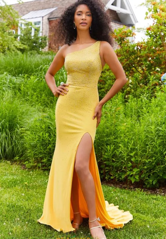 Captivate the crowd and strut into your event wearing this stunning long dress 47037 by Morilee. The fitted silhouette is made from a stretch jersey material and is embellished with sparkling glitter bead work. The asymmetrical neckline has a thin strap that wraps into a strappy semi open back. Be sure to leave a lasting impression when you show off the slit and dramatic train.