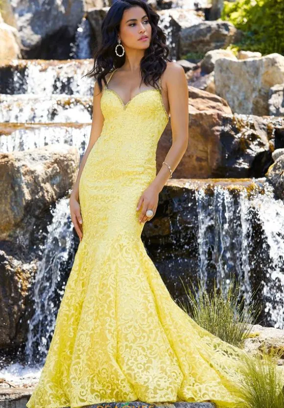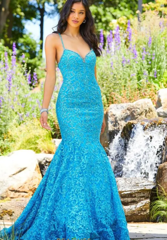 This one of a kind long mermaid dress 47039 by Morilee is an excellent choice for your special event. This lavish look is completely adorned with ravishing lace appliques paired with sparkling bead work. The v cut neckline and lace up open back is lined with hand sewn bead work to create a well rounded glow.