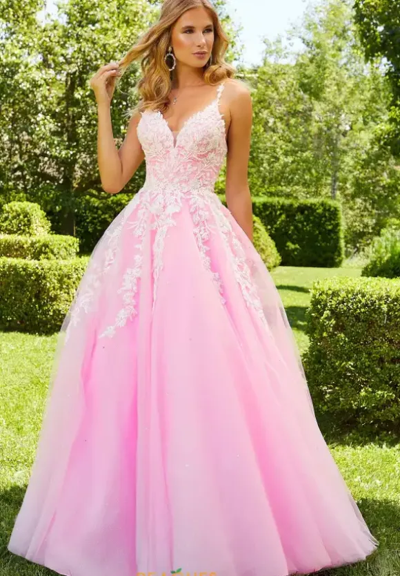 Available in gorgeous colors, this Morilee ball gown dress 47044 is a mesmerizing choice for your special occasion. White lace appliques paired with bead work adorn the fitted bodice and flow gorgeously past the waist. The v cut neckline has thin straps that wrap into a criss cross open back. Be sure to make an alluring exit when you show off the sweep train.