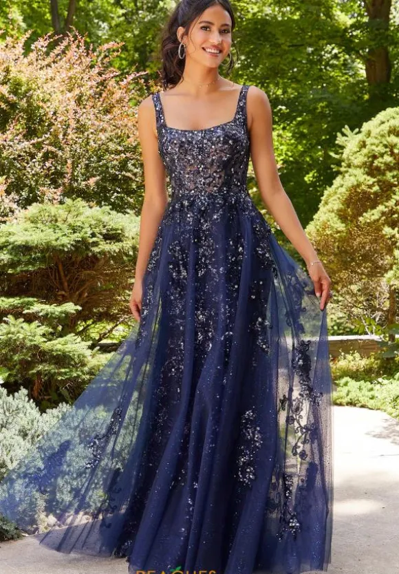 Channel your inner fashionista and wear this one of a kind long dress 47066 by Morilee. This versatile look showcases a fitted silhouette with detachable overskirt adorned with lace appliques. The scoop neckline has thick straps that wrap into a lace up open back. Additional features on this gown include a side front slit and train.