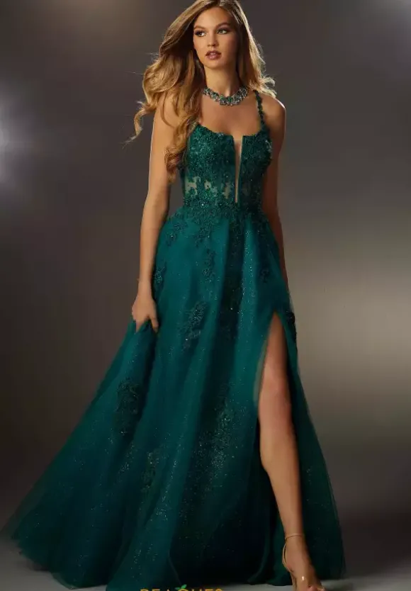 Be ready to stun all the guest wearing this Morilee 48005 gown on prom night. This ensemble features a scoop neckline and corset bodice that is decorated with floral applique which laces on the back. An a line skirt is styled with glitter tulle and reveals a high slit that is perfect for posing in front of the camera.