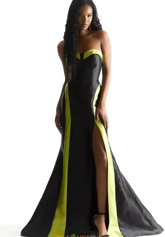 Look like Hollywood royalty at your prom in this sophisticated color block Morileee long dress style 59024. Made in contrasting satin color shades, this strapless gown showcases a corset bodice with a sweetheart neckline and lace up tie back. The fit and flared long skirt has a flounced fishtail back, slit and sweep train.