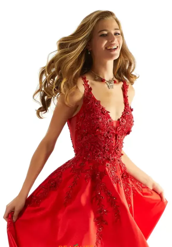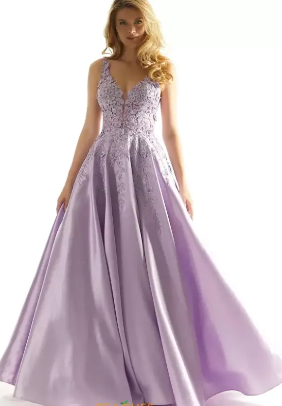 Get noticed at prom in this stunning classic Morilee ball gown style 49044 made in fabulous colors of matte Larissa satin and adorned with embroidered lace appliques and beading. This impressive gown features a fitted bodice richly embellished with embroidered lace and heat set stones with a V neckline, thick straps, illusion side panels and low V back with lower zipper. The long, a line skirt has embroidery trailing down and a sweep train.
