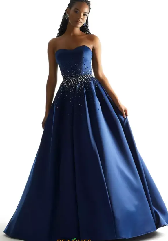 Look like royalty in this satin Morilee ball gown dress 49054. A strapless sweetheart neckline is featured on the fitted bodice while glistening beads adorn the small of your waist and scatter evenly onto the fitted bodice and voluminous satin skirt that is completed with pockets and a classic sweep train.