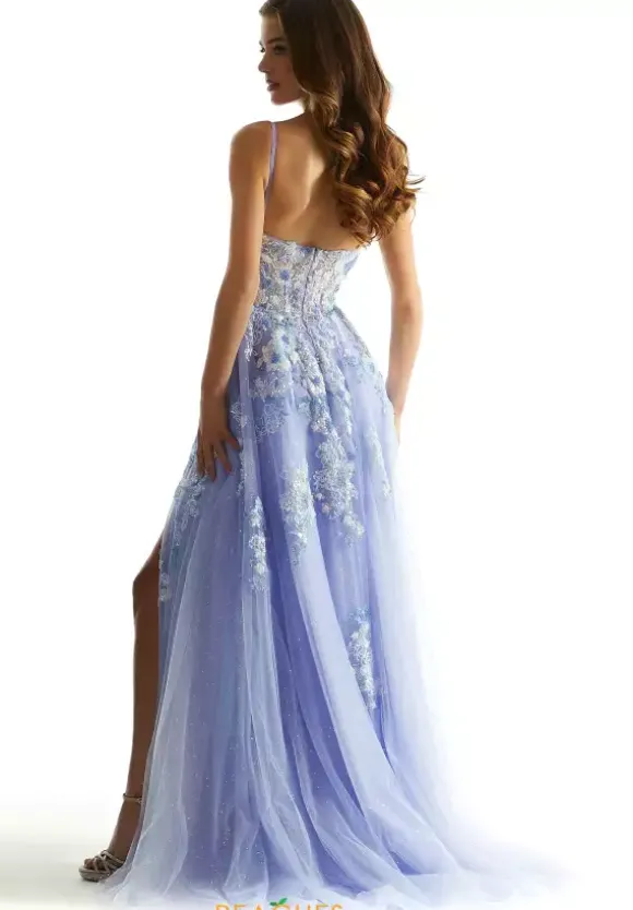 Look beautiful when wearing this elegant a-line dress by Morilee, style 49083. This ensemble features a scoop neckline corset top with delicate straps leading to a closure back zipper. Showcasing a skirt made out of sparkle tulle adorned with floral applique, sequins and beadwork throughout the dress. For the final touch it has a sexy slit.
