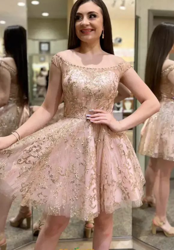Off the shoulder short damas dress 9583 by Morilee is the perfect choice for your special occasion. Made from a glitter sparkling material this scoop neckline showcases off the shoulder cap sleeves. The back has an adjustable lace up to assure the perfect fit. A small thin beaded belt defines your waist where you tulle skirt flares out from.