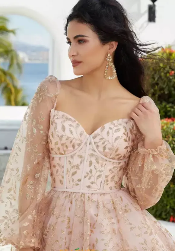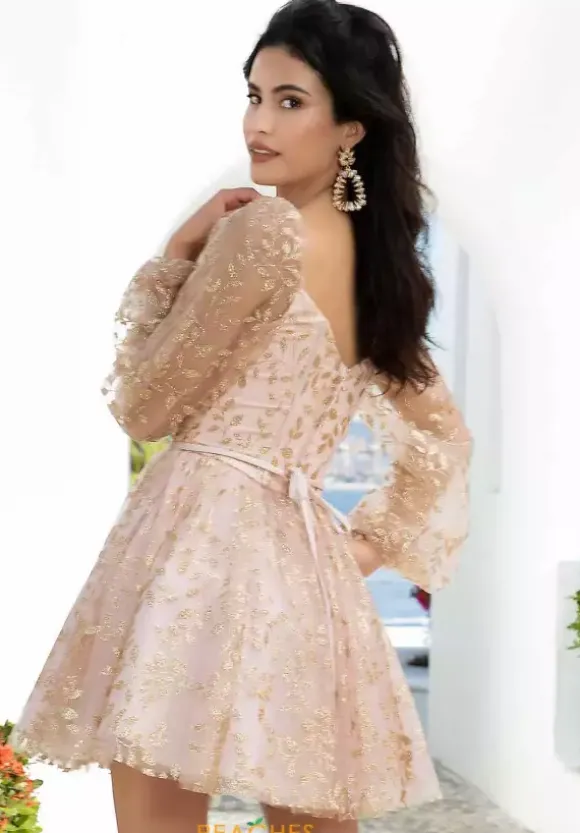 Have a fabulous entrance in this short Morilee Damas dress 9591. Featuring a flattering sweetheart neckline that is paired with gorgeous illusion sleeves. Showcasing the fitted corset bodice that is exquisitely embellished with floral glitter sequin and cascades down the flowy tulle skirt to have you glistening perfectly all night long.