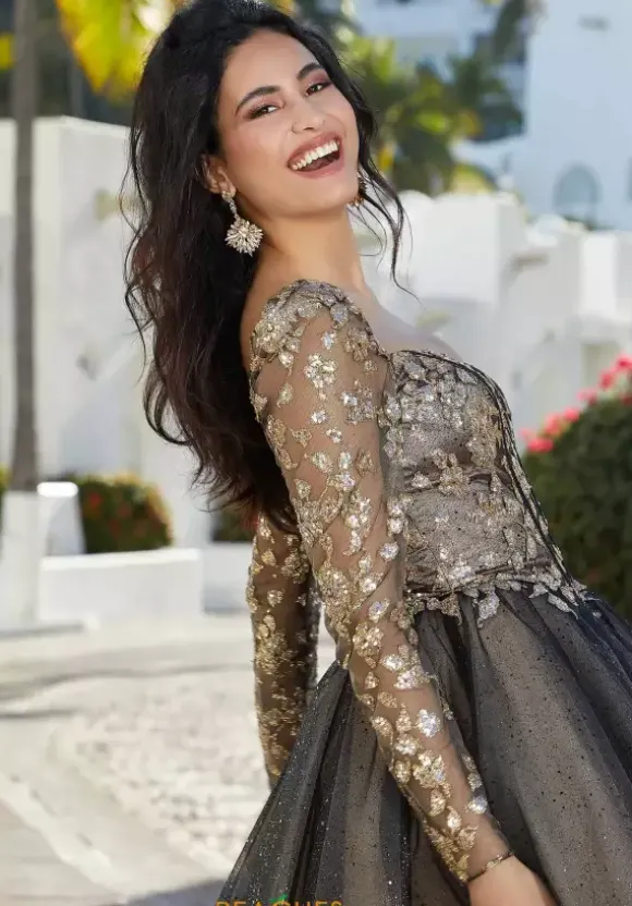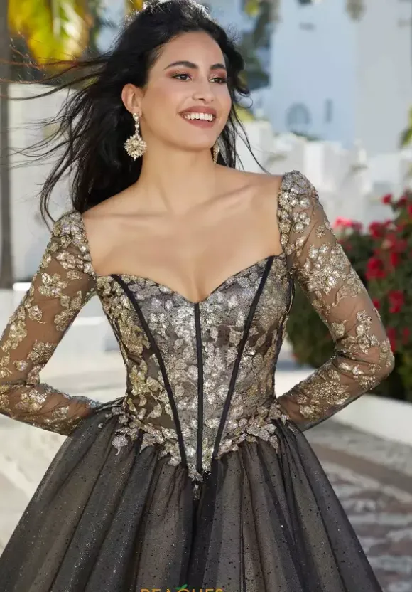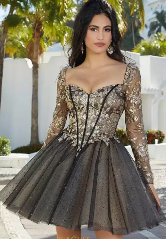 Be the star of the night when showing up in this incredible Morilee damas dress 9595 for your next occasion. The darling dress has a sweetheart neckline that is complimented with long sleeves. Featuring a corset bodice with exposed boning that is also embellished with glitter sequin. Highlighting the flare out of the a line skirt it is made of a glitter tulle and will have you dazzling all night long.
