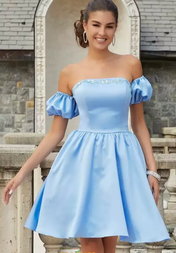 Fall in love with ultra chic Morilee damas dress 9612. Made from a sleek satin material, this strapless neckline dress is trimmed along the the edge with sparkling beadwork. The dress flare from the small of your waist giving you an a line look. The dress has a two in one look with detachable pouf sleeves.