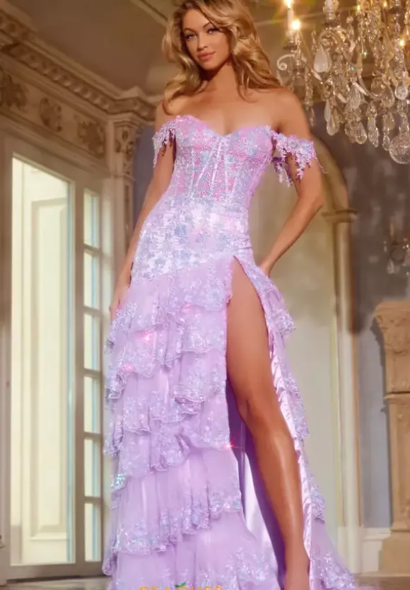 Make yourself the talk of the night wearing this divine long fitted dress by Jovani style, 40397. The bodice has a prefect off the shoulder sleeves featuring a stunning sweetheart neckline along with cap sleeves. The corset gives you that hour glass appealing look. Showcasing the exquisite applique with layering ruffles that has touches of lovey beadwork. A high thigh slit to show off your leg.