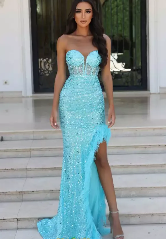 Strike a pose in exuberant style PS23029 by Portia and Scarlett. Stunning and on trend, this fitted dress features a dazzling corset bodice complemented by a strapless sweetheart neckline. The dazzling fitted skirt showcases a classic sweep train and an open thigh high slit fully lined in soft feathers.