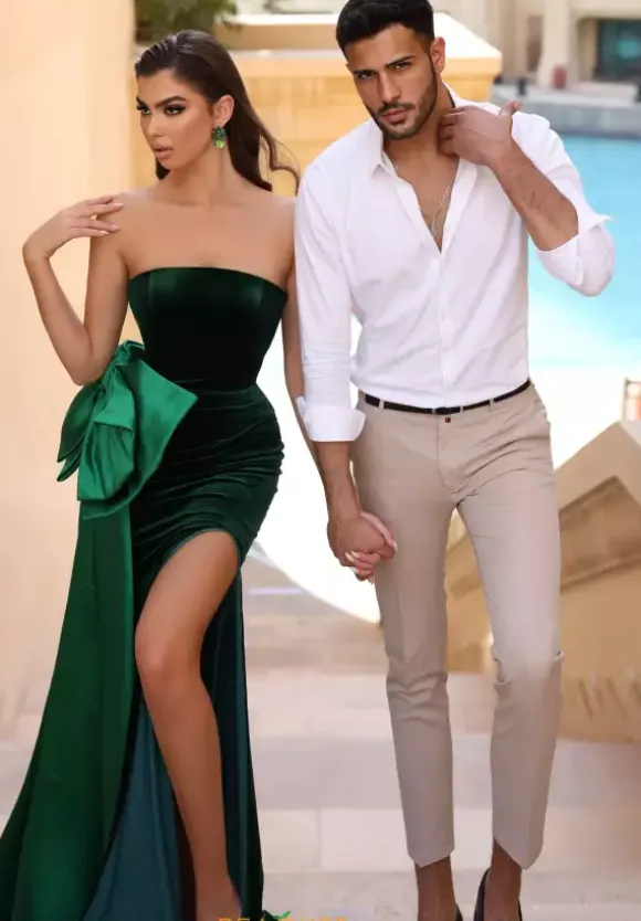 Feel and look as ravishing as ever in this captivating Portia and Scarlett dress PS23040. Exquisite fitted dress reveals a lovely strapless neckline. Gorgeous ensemble is entirely made out of lovely velvet material and is complemented by a taffeta material bow that is attached along the side of the waistline.