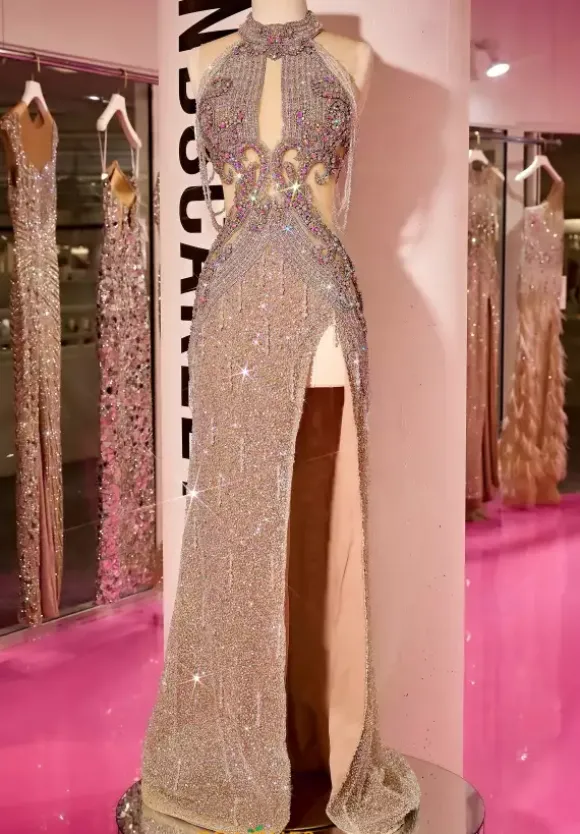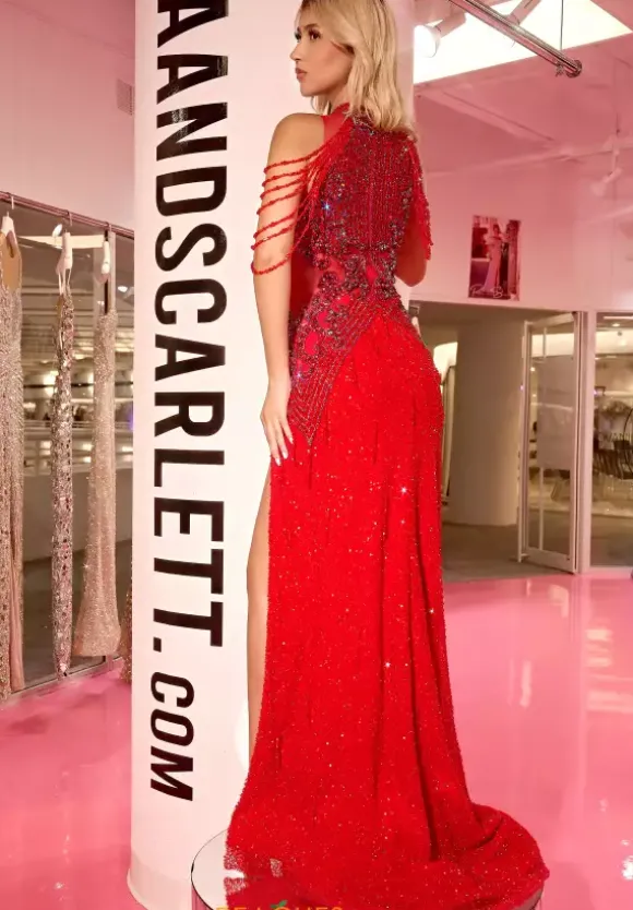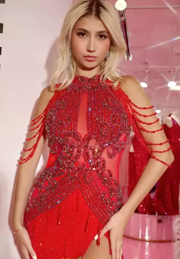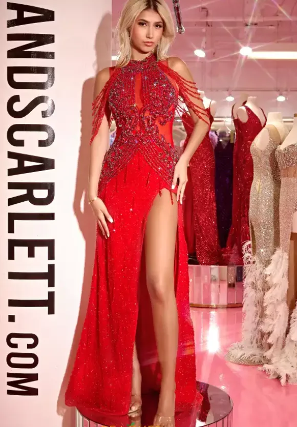 Live out your celebrity moment while wearing this one of a kind Portia and Scarlett dress PS23704C. Glamorous fitted dress reveals a halter neckline and is accompanied by beaded, layered, off the shoulder cap sleeves. Sheer bodice is beautifully adorned with shimmering beadwork that trickles down the lovely fitted skirt. Complimented by a risque thigh high slit, this gorgeous dress will definitely make you stand out.