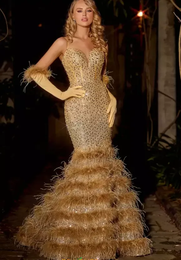 Be your own personal icon in this haute Portia and Scarlett mermaid style dress PS24037. The corset bodice accentuates the small of your waist while the skirt hugs your hips followed by the dramatic mermaid sweep train that has a pattern of feathers and sequins to match the entirety of the beaded dress. This dress does come with gloves.