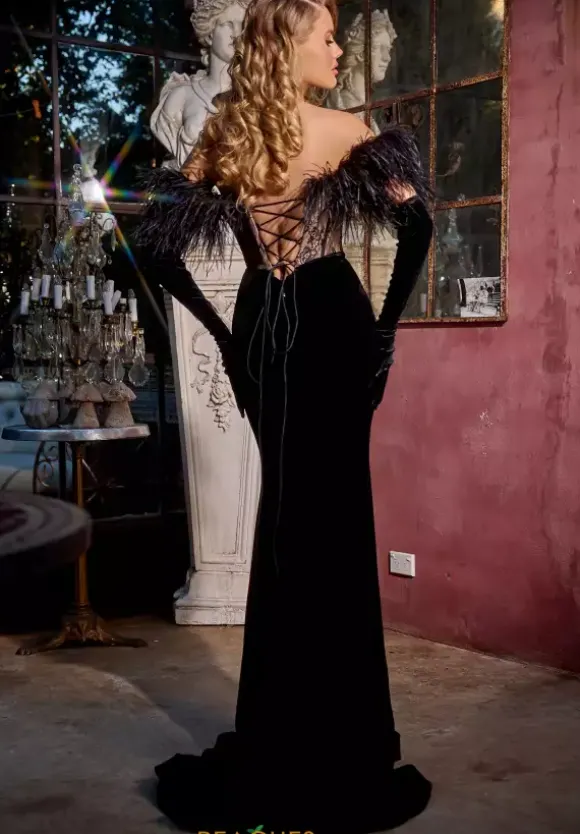 Strike a pose in this sensational Portia and Scarlett dress PS24044. This ravishing gown features a sophisticated strapless sweetheart neckline and elegant off the shoulder cap sleeves adorn in glamorous feathers. Alluring and appealing the corset fitted bodice highlights lovely lace detailing that adds a romantic edge. Made in a vivacious velvet fabric, the fitted silhouette hugs your curves, while an intriguing high slit makes for a memorable exit. Gloves sold separately.