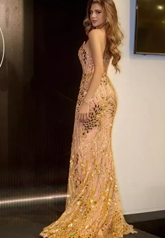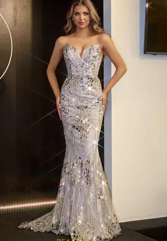 Outshine Barbie in this extravagant never before seen Portia and Scarlett dress PS24315. This fitted dress is sexy from top to bottom with a fitted silhouette that will effortlessly hug you in all the right places while shimmering combinations of glitter, cut glass beads, and sequins create ornate patterns that have an everlasting shine throughout the entire dress, ending at the glamorous sweep train.