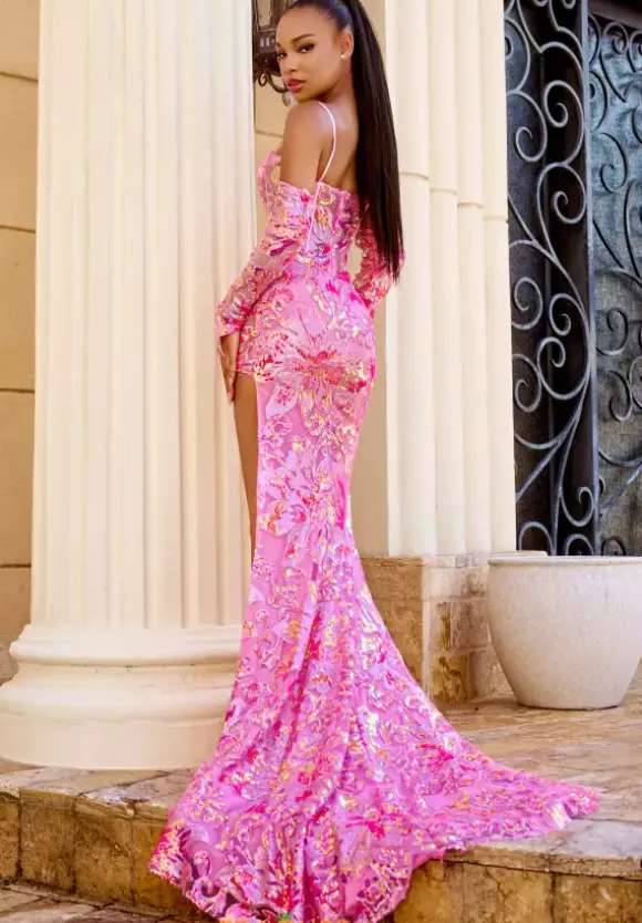 Make a statement at your next social occasion in this eye catching Portia and Scarlett long dress style PS23431 embellished with colored sequin appliques throughout. This scintillating silhouette showcases a corset bodice with exposed boning, scoop neckline, illusion panel, spaghetti straps and low zipper back. The long curve hugging skirt has a high side slit and sweep train.