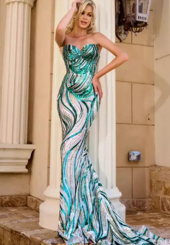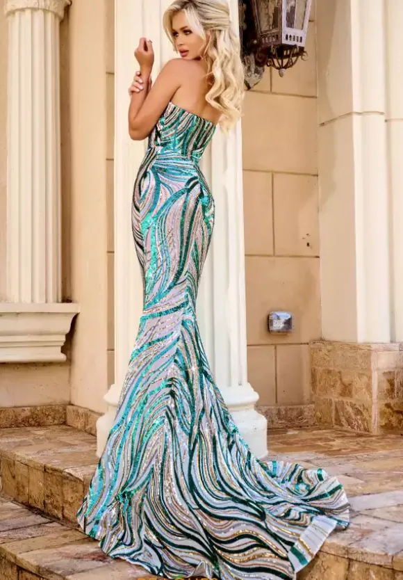 Magnetize the crowd in this eye catching Portia and Scarlett dress PS24341, a vivacious style perfect for your senior prom. Sexy, yet sophisticated this glamorous gown features a classic strapless neckline adorned in a full sequins and beadwork. Made in a flattering fabric, the fitted silhouette is adorned in a unique pattern.