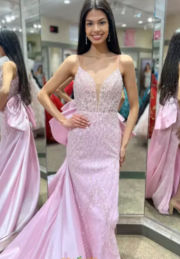 Exude elegance in this remarkable Portia and Scarlett gown PS24510. Lavish and extravagant, this dashing gown features a plunging v neckline with dainty thin straps an a sheer insert panel that adds a sense of comfort and edge. Radiant hand sewn beads adorn the fitted silhouette giving this gown the perfect pop of sparkle and glitz. Picture perfect, the captivating overlay skirt highlights an elaborate sweep train and lovely bow detailing.
