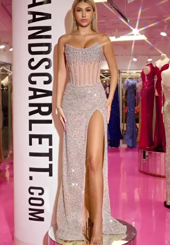 The perfect gown for any social event, long style PS24877C by Portia and Scarlett will have heads turning. The strapless neckline is paired with a waist snatching illusion corset bodice embellished with a delicate display of hand sewn beading. Showcasing the entire fitted silhouette that is delicately adorned along the skirt with sequin that will have you illuminating.