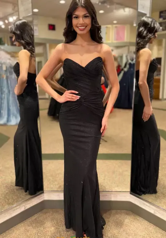 Be the definition of elegancy when wearing this elegant long dress from Portia and Scarlet style PS25230. Featuring a strapless V-neckline with rushing detailing that go across the bodice and a twisted knot effect that will for sure give you the perfect snatched waist look. This number is made out of stretch glitter material that will give you the right amount of sparkle to shine all night and has a train to complete your elegant look.