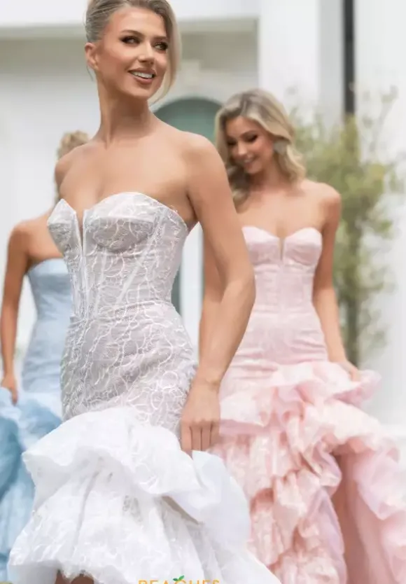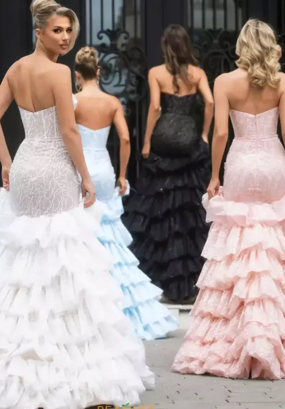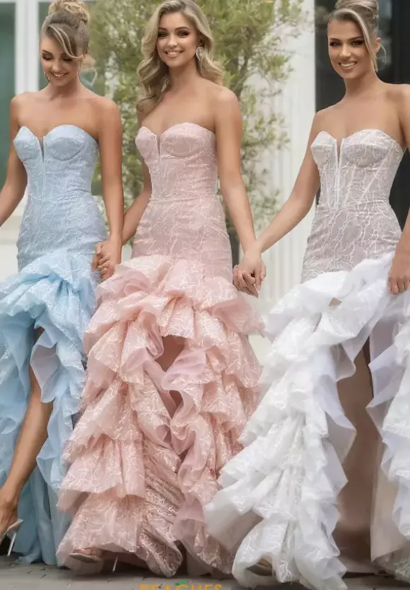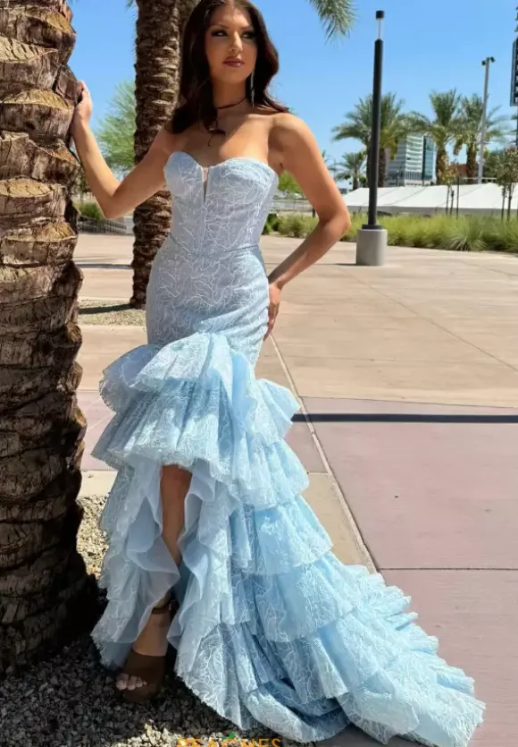 Feel like a modern day princess when wearing this enchanting long dress by Portia and Scarlett, style PS25250. Featuring a fitted mermaid silhouette with strapless sweetheart neckline. This ensemble is made out of novelty material and beautiful beadwork. A thigh high slit on the the ruffled skirt is the perfect final touch.